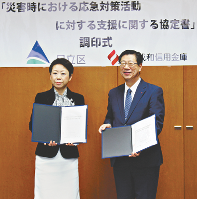 足立区と足立成和信用金庫(高杉浩明理事長/本店=千住1-4-16)が、「災害時における応急対策活動に対する支援に関する協定」を結んだ。