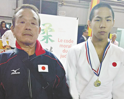 武岡くんは、昨夏のインターハイの男子60㎏級で優勝したことから、フランス派遣の高校柔道選抜チームの一人に選ばれ、足立学園柔道部の徳原勉先生(63)とともに渡仏。トーナメント方式の大会では、6人と対戦し、すべて一本勝ちした。