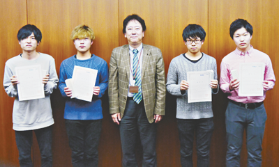 学生は、豊田太輝さん(工学部環境化学科2年)、山口立郁さん(工学部機械工学科先端機械コース2年)、加藤大貴さん(同)、萩村岳也さん(工学部機械工学科先端機械コース1年)。全員、29・30日に行われた学祭「旭祭」の実行委員だった。