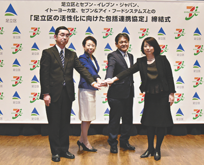 写真上/足立区の活性化に向けてお互いの協力を誓う近藤区長とセブン&アイグループ3社の代表=区役所ホールで