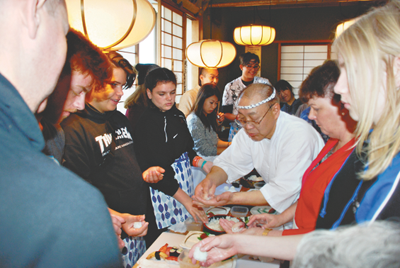 7日(土)、使節団一行はギャラクシティ西新井の裏通り沿いにある寿司屋「魚がし寿し」(島根3-9-9、TEL3858・4102)を訪問。ご主人の柏倉幸男さん(66)と奥さんのたついさん(65)が出迎えた。ここでは、お寿司づくりを体験。普段から外国人のお客さんに寿司づくり教室を開催している同店。柏倉店主は「ライスをボートの形にして、ツナ(まぐろ)をのせてね」と英語を混じえて身振り手振りで説明。使節団全員が初めてとは思えないほどきれいな仕上がりに、奥さんから「グッド。ビューティフルね」と褒められるとみんな笑顔に。その後、自分たちの作った握り寿司を試食した。