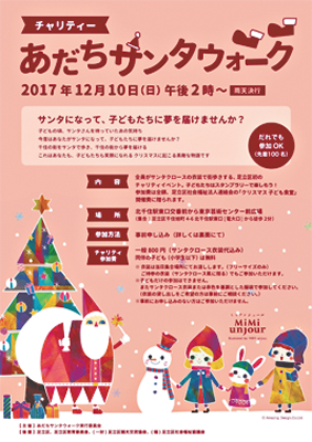 今年8月に結成された区内の社会福祉法人のネットワーク組織「足立区社会福祉法人連絡会」(近藤常博会長)、ジェイコム足立、区商店街振興組合、足立成和信金などで作る実行委員会が、12月10日(日)午後2時から北千住で100人規模の「チャリティーあだちサンタウォーク」を実施する。