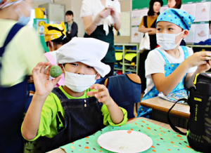 手順は消毒した手でよもぎ餅を平たく伸ばし、あんこ玉を包み込むという簡単なもの。1年生にとってはこれがなかなか難しく、餅を丁度いい大きさに伸ばせなかったり、包んだ餡がはみ出してしまったり。うまくできた子もそうでない子も、完成した月見団子を大事そうに食べ、笑顔と歓声が溢れた。「上手に出来る作り方を教えてもらってうれしかった」「みんなで作れて楽しかった」などの感想が次々に上がった。