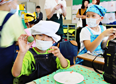辰沼小学校(工藤洋巳校長)の1年生が、「あきをさがそう」のテーマで和菓子づくりに挑戦した。生活科の授業の一環で、地場産業と日本の伝統を学ぶというもの。講師は両親が創業した「いせや菓子店」(佐野2‐25‐12)で働く星知賀子さん。普段は佐野住区センターで高齢者向けに練り切り教室を開いているが、学校は初という。
