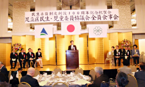 最初に、小久保隆足立区民生・児童委員協議会会長が主催者を代表して挨拶。来賓の近藤やよい区長は「行政の至らぬ『穴』を温かく丈夫な糸で繕ってくれているのが民生・児童委員だ」と感謝の言葉を述べた。第二部では、食事をしながら親しく歓談。