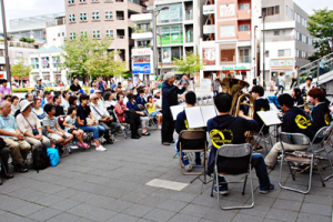 写真/東京電機大吹奏楽による演奏=電大前ステージで