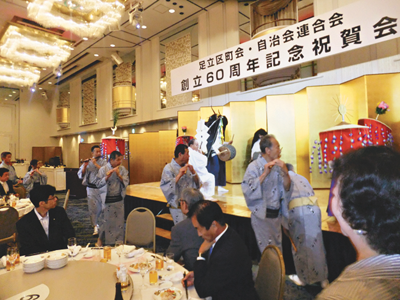 8月4日(金)、足立区町会・自治会連合会(有馬康二会長)の創立60周年記念式典&祝賀会が、浅草にあるビューホテルで開かれ、約270人が町自連の「還暦」を祝った。その前に行われた平成29年度の総会には、区内203の町会・自治会が参加。有馬会長は、「地域を誰もが住みやすい場所にするため、町会・自治会で出来る活動を考えよう」と呼びかけた。