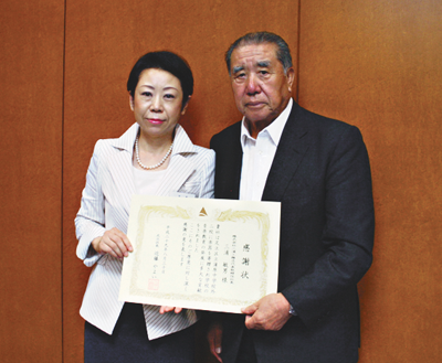 写真/感謝状を受け取った三浦会長(右)と近藤区長=区役所で