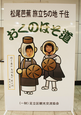 7月20日(木)、足立区観光交流協会は千住5丁目の「学びピア21」1階に置かれていた松尾芭蕉とその弟子・曽良の顔出し看板を、東武線北千住駅改札を入ってすぐ右側に移動した。