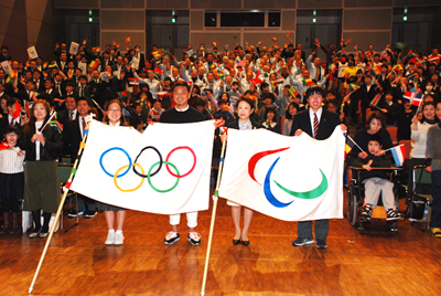 3月27日(月)、足立区役所で東京都内62の市区町村をリオの風を浴びたフラッグが巡る「東京2020オリンピック・パラリンピック フラッグツアー」の歓迎セレモニーに300人が出席した。フラッグアンバサダーのひとりサッカー元日本代表の城彰二さん(41)から、足立区を代表して千寿桜堤中学校2年の田口優美さんと、足立特別支援学校2年の安本諒さんにフラッグが手渡された。