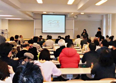 写真/大勢の参加者で熱気ムンムンのプレゼンテーション=東京未来大で