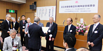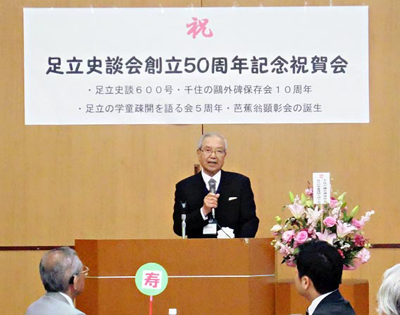 1968年(昭和43年)2月に創立された足立史談会(堀川和夫会長)が、今年50周年を迎え、4月22日(日)、綾瀬プルミエで記念祝賀会を開いた。各界から約140人が参列し、にぎやかに半世紀の歴史を振り返り、今後の発展を誓い合った。