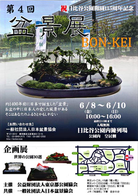 同協会は、100周年を迎えた2年前の秋に「日本と世界の絶景」をテーマとする記念盆景大会を、昨秋は「東海道五十三次」をテーマに同公園で盆景展を開催、好評を博した。今回は、日本で最初に出来た公園である日比谷公園開園115周年記念行事の一つとして実施、テーマは「世界の公園」。杉原会長の新作・日比谷公園を始め、ナイアガラの滝、マッターホルンなど30点が並ぶ。