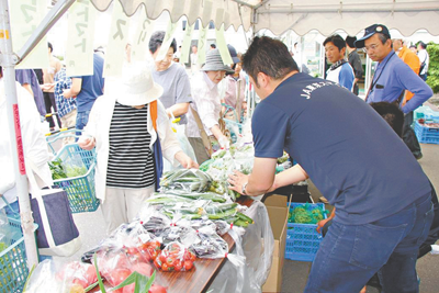 野菜は、島根の牛込農園、神明南の宇佐美農園など「あだち菜の郷」登録の区内46軒の農家で獲れた枝豆、トマト、ナス、キュウリ、コマツナ、インゲンなど約3000点が持ち込まれたが、約300人分が午前中に完売。同様のイベント「共進会」が、6月23日(土)同場所で同時間に開催される。