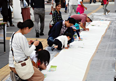 イベントでは、通りに敷いた長いロール紙に参加者が好きな絵を描いていた。絵は、自分の似顔絵や好きなアニメのキャラクターなど様々。