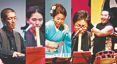 くれなゐ楽団は、篳篥、尺八、筝、和太鼓にシンセサイザーを加え、斬新なアレンジで懐かしの昭和歌謡、童謡唱歌、ラテンなど幅広いジャンルの曲を通して和楽器の魅力を伝えている。誰でもが気軽に音楽体験を楽しめるように、入場無料の定期公演を実施。メンバーは、写真左から菊地慶太さん(キーボード)、豊嶋貞雄さん(尺八)、酒井悦子さん(箏)、大賀悠司さん(尺八)、関根まことさん(和太鼓)。当日の演奏曲は「日本の四季メドレー」「夜来香」「故郷」「浜辺の歌」「ベートーヴェン交響曲第5番」「海ゆかば」など。