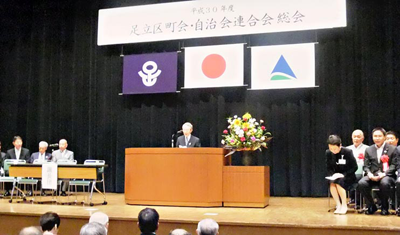 8月1日(水)、平成30年度の足立区町会・自治会連合会(有馬康二会長)総会が、足立区役所庁舎ホールで開かれ、区内216の町会・自治会から約270人が参加した。