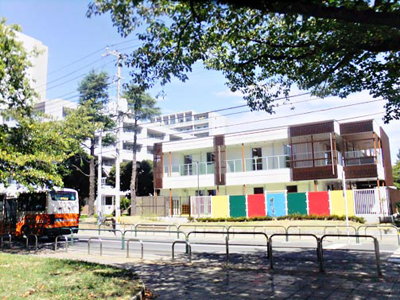 竣工した新園舎は、軽量鉄骨造2階建て。公園内の歩行者道路を残し、URの高層団地に挟まれるように建った。