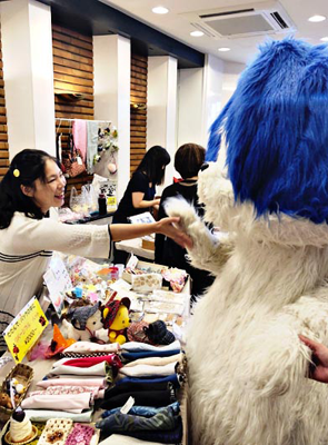 写真/お店の人と触れ合うアダチン=ピーくんカフェで