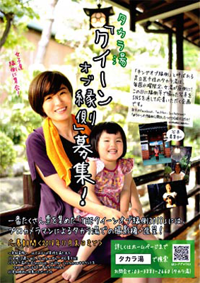 【賞品】クイーンにはプロカメラマンによる2時間の撮影(友人や家族が一緒でもOK)と写真データ進呈。上位10人には銭湯グッズ進呈