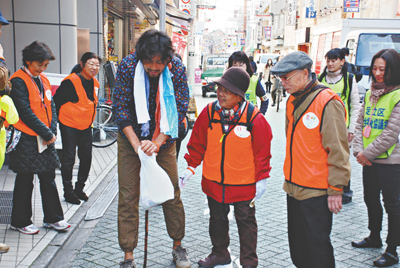 12月1日(土)、千住旭町商店街(宮本勝男理事長)で、常東地域あんしん拡大推進会議による「高齢者声かけ訓練」が初めて行われ、約50人が参加した。