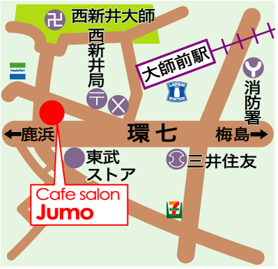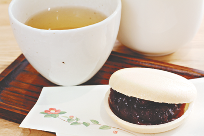 西新井大師参道を大師から環七通りに向かってまっすぐ歩き、通りに出る角に昨年4月にオープンした「Cafe salon Jumo(カフェサロンジュモ)」(西新井1-6-6、TEL3897・2897)。お土産にピッタリな「まめつばきまめもなか」が評判のお店だ。