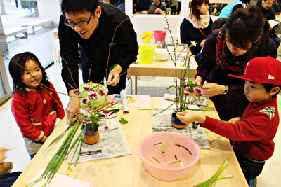 写真/初めての生け花に挑戦する子どもたち=ギャラクシティで