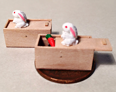 からくり玩具「ウサギとニンジン」。ふたを開けるとニンジンが飛び出す