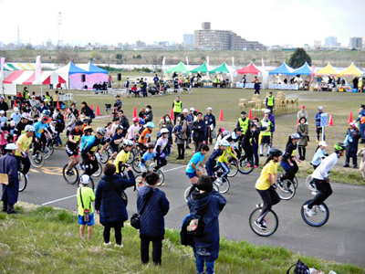 写真/一輪車マラソンがスタート!=荒川河川敷で