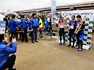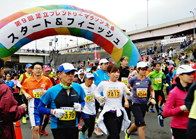 東日本大震災復興支援の第9回足立フレンドリーマラソン(実行委員会主催)が、12月23日(日・祝)に荒川河川敷で開催され、全国から7369名が出場した。集まった義援金総額約67万円は福島県へ送られる予定。