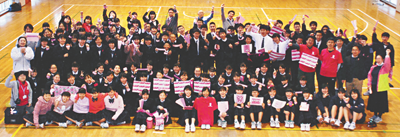 写真/ピンクの物を持ち寄ったみんなで記念写真=江北桜中体育館で