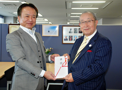 下/大高常務理事(左)に寄付金を渡す石塚理事長=社会福祉協議会で