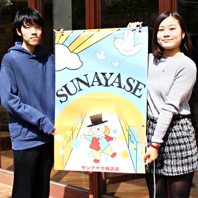 2人は実際に商店主たちの話を聞いたり、同商店街の周辺を歩いてイメージを膨らませ、サンアヤセ商店街ということで、サン=太陽と楽しいイメージのピエロやハトを描いた。商店街の人たちも「学生たちが素直に感じたイメージを明るく表現して、素敵なものができた」と喜ぶ。