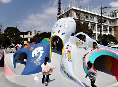 新西新井公園に1965年に設置されたものは、全国でも第1号とされている。この元祖タコすべり台は、3月2日(土)に子どもたち24組63人が参加して塗り替えが行われ、公募の中から選ばれた杉山彩さんのデザインに生まれ変わった。