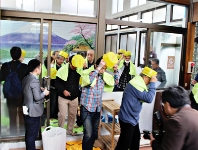 全員が男湯の浴室に集まり、体を洗っているとの想定で椅子に座って待機していると、地震発生を知らせるハンドベルが鳴り響いた。すぐさま、店主の森山篤さん(56)と息子の雄大さん(25)が駆け付け、ガラスの破片対策として足ふきマットを避難経路の上に敷くと同時に、入浴客にバスタオルを渡して肩にかけるよう指示してから誘導。全員がスムーズに脱衣場から外へ避難した。