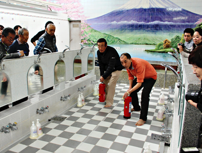 一般人を含む約50人が参加。都内初の試みとあって、区内全銭湯の経営者らに加え、区外の銭湯関係者、区内消防署員も見学に訪れた。足立区の銭湯は昨年4月に全軒でAEDを設置するなど、日頃から地域貢献の意識が高い。全員が男湯の浴室に集まり、体を洗っているとの想定で椅子に座って待機していると、地震発生を知らせるハンドベルが鳴り響いた。すぐさま、店主の森山篤さん(56)と息子の雄大さん(25)が駆け付け、ガラスの破片対策として足ふきマットを避難経路の上に敷くと同時に、入浴客にバスタオルを渡して肩にかけるよう指示してから誘導。全員がスムーズに脱衣場から外へ避難した。