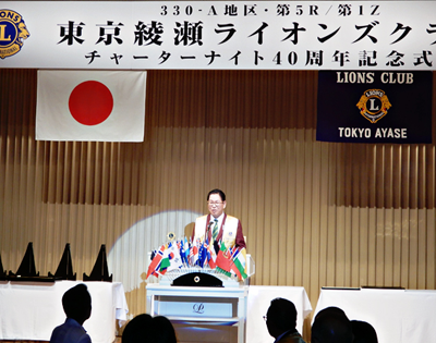 東京綾瀬ライオンズクラブ(大森光德会長)が、今年結成40周年を迎え、3月18日(月)港区芝公園にある東京プリンスホテルで「チャーターナイト(創立)40周年記念式典」と祝賀会を開いた。この日は257人が出席して盛大に創立を祝った。 同クラブは、東京葛飾東ライオンズクラブを親クラブとして1978年(昭和53年)に結成された。足立区民まつりでの献血活動、薬物乱用防止教室の開催、障がい者施設への支援など様々な奉仕活動などはよく知られており、支援を受けた団体などに感謝されている。