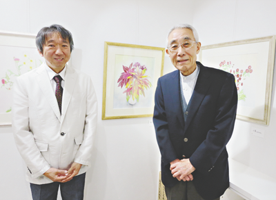 水彩画歴11年となると、保管する絵も数えきれないほどになり、今回、その中のお気に入りの35点を展示した。白を基調とした美しい池之端画廊は、角田さんが師事した鈴木英之先生が代表を務める。「研究熱心で真面目に一生懸命水彩画に向き合っている」と角田さんを称賛。「どんなに有名な絵でも、観ていると疲れることがある。僕は絵に想いを込めるのではなく、観る人がホッとするような絵を描きたい」と望む角田さんが、今お気入りの作品は、写真の「葉げいとう」。細部にこだわり苦労して仕上げた力作だ。「続ける限り元気で描き続けたい」と喜寿を迎える角田さんは血気盛んだ。