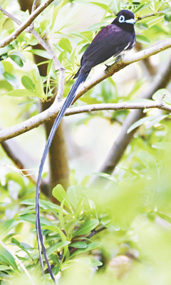 【メモ】サンコウチョウは、オスが全長45㎝、メス17・5cm。目の周りとくちばしはコバルト色。日本では5月ごろ本州・四国・九州・沖縄に夏鳥として渡来し、平地から低い山のうす暗い林で繁殖。さえずりはけたたましく、「ツキ(月)ヒ(日)ホシ(星)ホイホイホイ」と聞こえるところから、三つの光、三光鳥の名がついた。30㎝もの長い尾をひらひらさせて飛ぶオスの姿は圧巻。日本で繁殖し、秋、南方へ渡る。