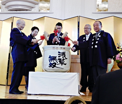 写真上/初鹿野理事長(右)、近藤区長らが鏡開き=浅草ビューホテルで