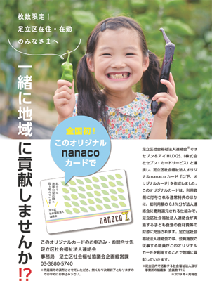 当日は、同連絡会がセブン&アイホールディングスと連携して、6月末にオリジナルnanacoカードを作成したことが報告された。このカードは、総利用額の0・1%が同会に寄付還元される仕組みで、その寄付金は同会が実施する子ども食堂の食材費などの財源に充てられるという。このカードは、7月11日(木)から区内在住・在勤者にも頒布されている(枚数限定)。総会ではさらに、慢性的な人手不足解消のため、10月23日(水)に高齢、障がい、児童の各部門合同の「福祉のしごと相談・面接会」を開催することを決めた。【問合せ】TEL3880・5740社協