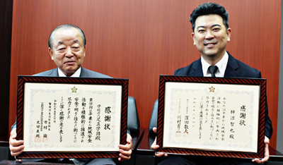 写真上/感謝状を手に初鹿野理事長と柿沼氏(右)