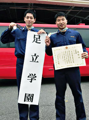 同校では、消防にも力を入れている。教職員による自衛消防隊が、7月3日(水)、千住消防署で行われた同管内の自衛消防隊の審査会で準優勝した。篠岡慶昴教諭(指揮者)と中畑友祐教諭(隊員)が代表で出場し、的確で素早い行動、大きな声、息の合ったチームワークで観客を魅了。17チームの中で優秀な成績を収めた。足立学園では今後も千住地域の防犯活動に貢献できるよう努め、また消防審査会では優勝を目指したいとしている。