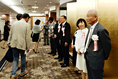 写真/来場者を迎える中田会長(中央)ら協会役員=浅草ビューホテルで