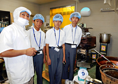 取材を終えての感想は「ワタトーさんでは、98年の手作りの歴史を守りながら、新しいきな粉菓子の開拓を目指しているのがすごいと思った」(小澤くん)、「都市農業公園では、無農薬のトマトを獲らせてもらい食べたが、すごく甘くておいしく、やっぱり無農薬だと味が違うなと感じた」(清水くん)、「保護猫カフェでは、飼い主がいなくなった猫を保護して育てている姿に感心した。色々な所を取材して、新聞づくりの大変さが少しはわかったような気がする」(幸くん)。写真/左から渡辺社長、清水くん、小澤くん、幸くん=「ワタトー」で