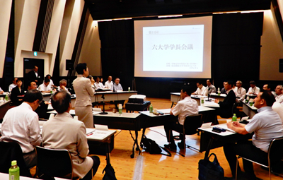 参加したのは、澤和樹東京芸術大学、來生新放送大学、角山剛東京未来大学、沖永莊八帝京科学大学、平栗健二東京電機大学、近藤研至文教大学の6大学の学長・副学長、近藤やよい区長、各大学と区の関係者ら約60人。
