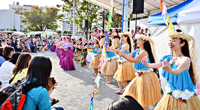 10月6日(日)、綾瀬駅東口前の「ハト広場」に、優しいハワイアンの調べが流れ、ハワイ料理やグッズなどのブースが並んで、訪れた約3000人が交流し、絆を深めた。
