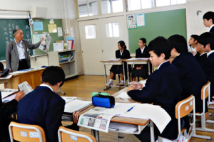 写真/小紙編集長の話を聞く生徒たち=第十三中で