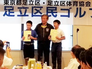 また、同時開催の区民ゴルフ大会では、74のスコアを出した服部仁さんが男子グロスの部で優勝、同78の利根川チネ子さんが女子グロスの部で優勝した。写真上/芦川会長から表彰される金杉くん(右)と金城くん=千葉・野田市の紫カントリークラブで