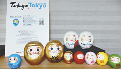 この「はっぴーだるま」、大きさは各種あるが、人気があるのは高さ9㎝、5㎝の可愛いサイズ。色も、金、青、緑、ピンクなど10色もあり、顔はどれも金色の塗料で描かれている。2年前から西新井本町を拠点にだるまの製造・販売をしている「㈱Crista(クリスタ)」の商品だ。鳳凰の髭に龍の眉というオリジナルのデザインで、商標登録、意匠登録も済ませている。
